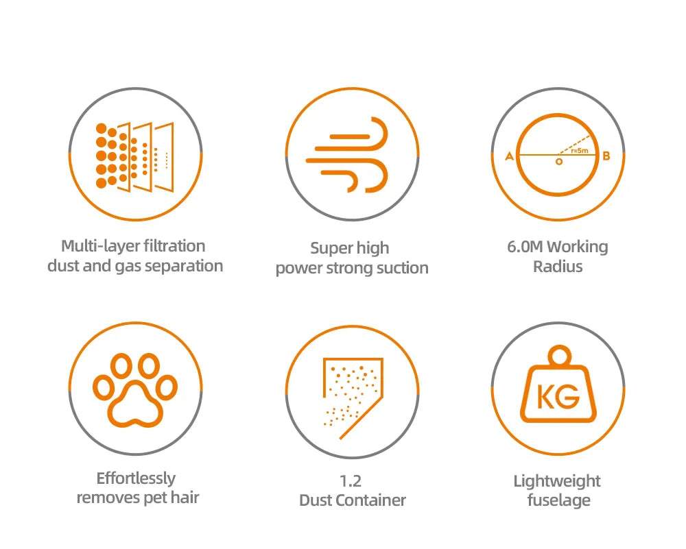 Rază de acțiune de 6.0 metri: Permite aspirarea unei zone mari fără întreruperi pentru schimbarea prizei.