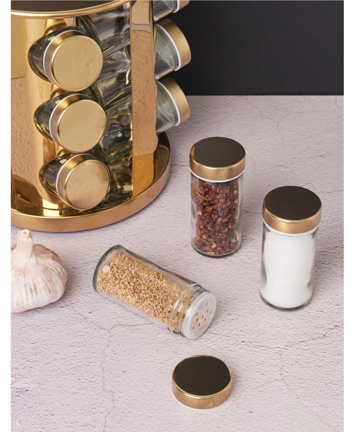 Set 12 recipiente, At Performance, pentru condimente, cu suport inox rotativ, auriu