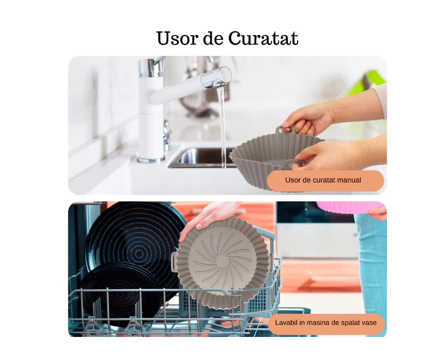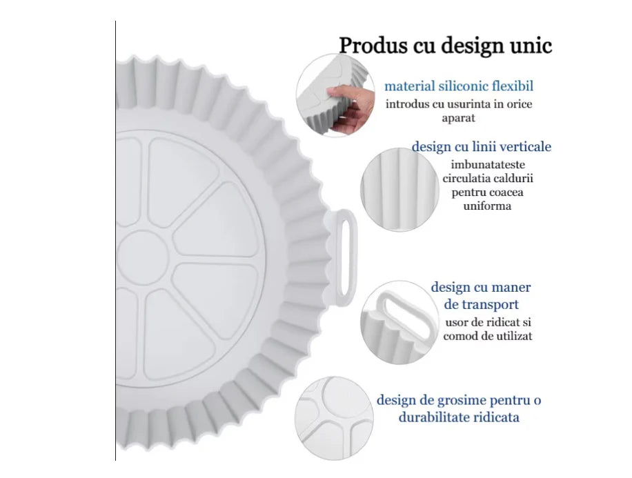 Adauga o nota de culoare si functionalitate bucatariei tale cu tava pentru Air Fryer din silicon, si bucura-te de preparate sanatoase si delicioase in fiecare zi!