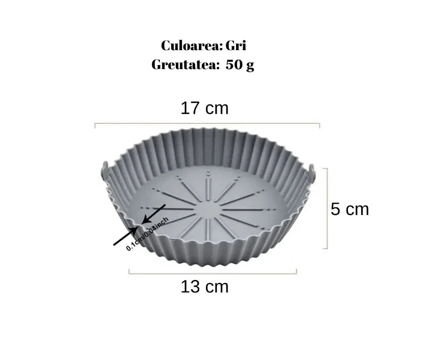 Descopera avantajele gatitului sanatos si eficient cu tava pentru Air Fryer din silicon in nuanta vibranta de gri. Conceputa pentru a se potrivi perfect in air fryer-ul tau preferat, aceasta tava este solutia ideala pentru prepararea alimentelor preferate fara utilizarea excesiva de ulei sau grasimi.